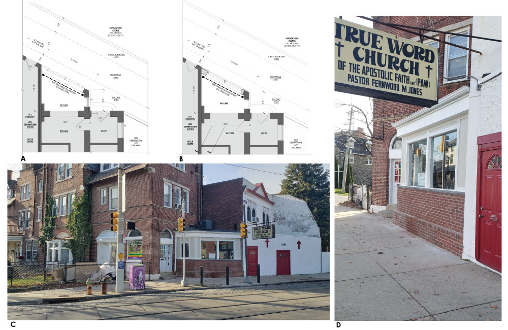 A: existing floor plan w/ removals and bracing B: floor plan w/ new facade and bracing C: perspective view across germantown ave D: perspective detail view from adjacent sidewalk |