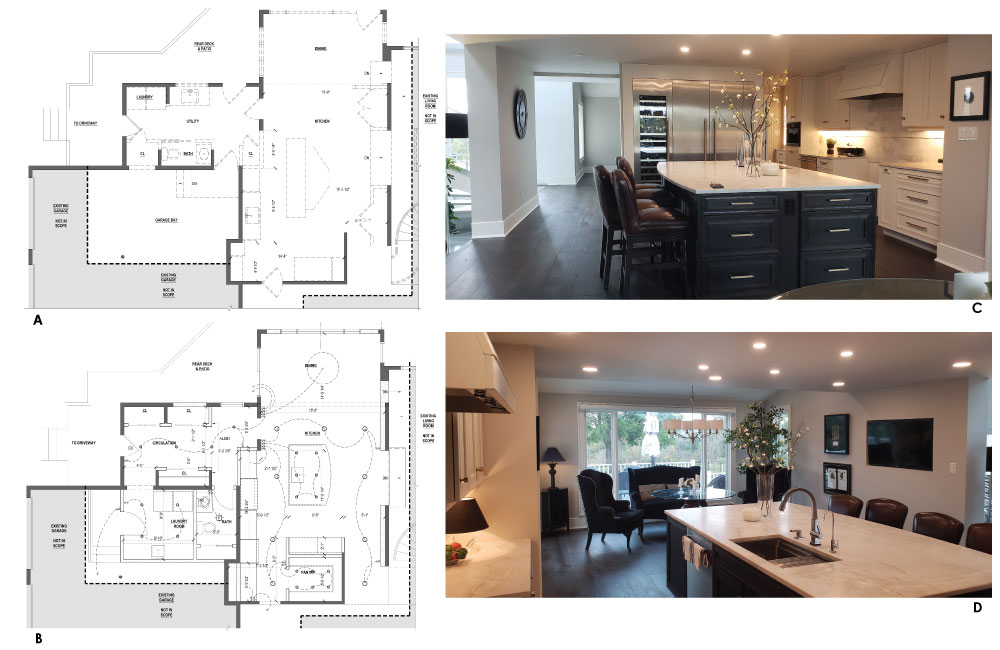 A: existing ground floor plan w/ removals B: new ground flood plan w/ renovations & alterations C: view of new kitchen from dining area D: view of new dining area from new kitchen island |