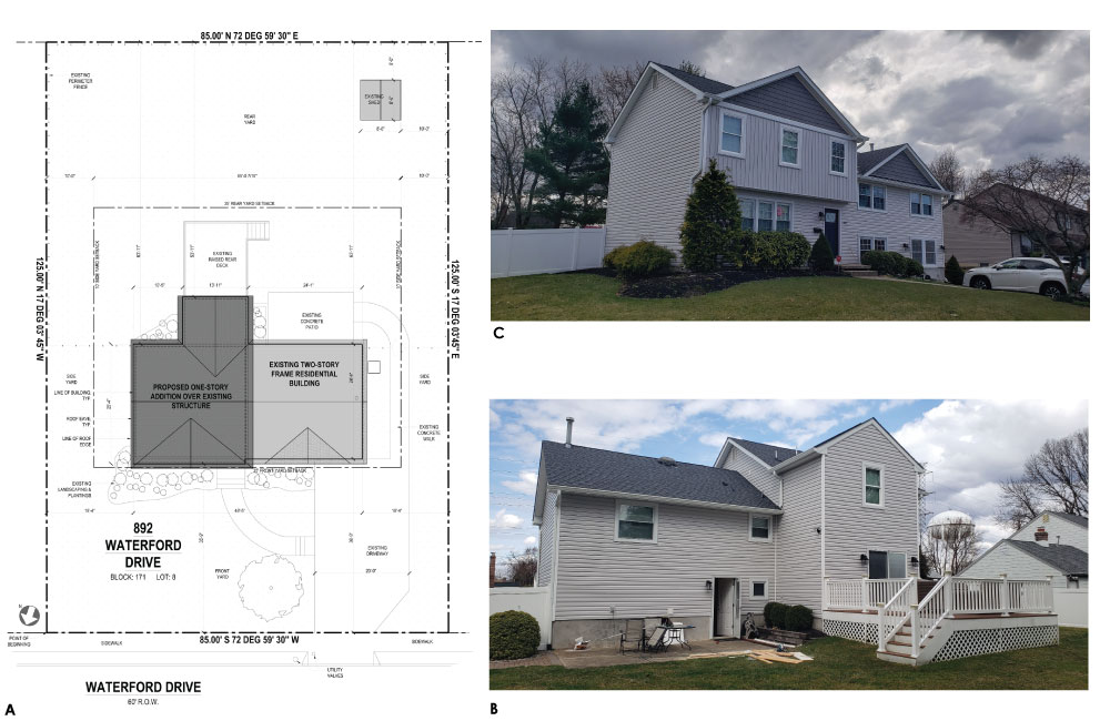 A: site plan w/ location of second-story addition B: view of addition from rear yard C: view of addition from front yard |
