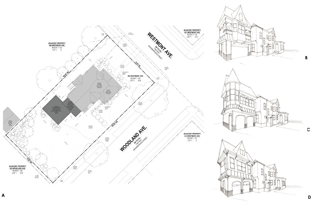 A: site plan w/ second-story addition B: design development drawn perspective view from front yard C: design development drawn perspective view from front yard D: design development drawn perspective view from front yard |